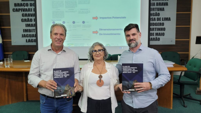 Com a implementação, espera-se que a região litorânea e serrana compreendida entre os 18 municípios da Amurel possa se consolidar como um grande destino turístico do estado e do país, atraindo visitantes das mais diferentes regiões. Além disso, o plano busca promover o desenvolvimento econômico e social dessas regiões, gerando empregos e renda para as comunidades locais. Nesse sentido, os Municípios que adotam o Plano de Turismo Serra Mar como diretriz têm a oportunidade de impulsionar seus setores turísticos e se tornarem destinos mais atraentes e competitivos. Com uma estratégia bem definida e ações coordenadas, podem alcançar resultados significativos e duradouros no campo do turismo, contribuindo para o desenvolvimento econômico e social de suas regiões. As representantes da Interface, a turismóloga Regina Cardona e a especialista em náutica Michele Castilhos, fizeram apresentações e considerações resumidas do Plano. O material será disponibilizado em breve no site www.cimamurel.org.br. Foram entregues simbolicamente dois exemplares impressos pela empresa Interface Hospitalidade, executora do projeto, ao CIM/Amurel. O ex-presidente do CIM, prefeito de São Ludgero Ibaneis Lembeck, e o presidente Hélio Alberton Junior receberam os exemplares.
