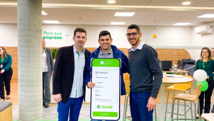 Gerente da agência Sicredi Içara Cleber Milak com o associado ganhador e o gerente de negócios Pessoa Física Anderson Barbosa