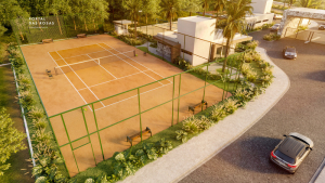 A área de lazer é um dos destaques do projeto, somando mais de 3 mil m², com espaços projetados para diferentes perfis de moradores. Entre os equipamentos previstos está uma quadra de tênis de saibro com medidas oficiais, reforçando a proposta de oferecer infraestrutura completa e estrutura diferenciada dentro do condomínio.