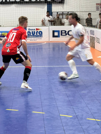 Caco e Tavinho travaram bons duelos durante a partida Dois bons jogos deram a largada na edição 2024 do Aberto de Futsal de Grão-Pará, competição que começou na noite desta quarta-feira e terá como palco o Ginásio Pedro Ivo Campos. Nos dois jogos foram anotados dezesseis gols, com Petry, do APFC, sendo o artilheiro da noite com os três gols marcados na vitória sobre o Cachorrada EC. Destaque também para a atuação do ala Da Rosa na vitória do Cabanha Kuntz/Infotec sobre o Time do Ano.