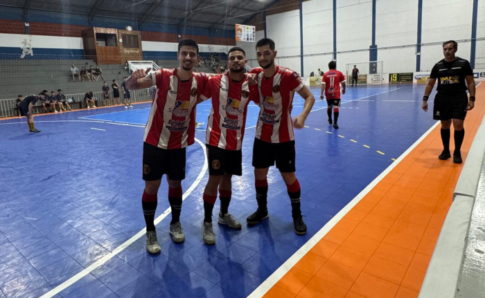 Kauã, Samuel e Morgan comemorando o quarto gol do Cabanha Duas equipes nadam de braçadas na edição 2026 do Interempresas de Futsal de Grão-Pará. O Cabanha Kuntz/Word Papelaria e Tecnologia goleou nas três partidas que fez, garantindo o primeiro lugar das Chave B e o Carvão Aiurê/DGW Desentupidora venceu as duas e caminha para fechar a fase com três vitórias na Chave A, empatando em aproveitamento com o rival.