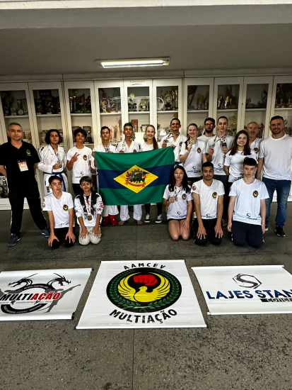 Equipe e comandantes da AAMCEV/CMEBN com as conquistas em Criciúma Caratecas de cinco escolas de Braço do Norte, integrantes da equipe AAMCEV/CMEBN, estiveram em Criciúma no último sábado, 16 de setembro, para participar da 3ª Etapa do Campeonato Catarinense Escolar de Karatê e voltaram comemorando a conquista de onze medalhas, três delas de ouro. O ginásio de Esportes da FME Criciúma foi o palco das disputas.
