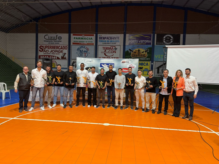 Melhores do campeonato e seus troféus na noite de premiação em Gravatal A quadra do Ginásio Valentim Kindermann foi transformada num palco, com telão, placas, mesas e cadeiras para os convidados do evento que premiou os destaques do Municipal de Futebol de Gravatal edição 2025, que teve em disputa a Taça Antonio Longo. Presentes no ginásio, autoridades locais, dirigentes, jogadores, imprensa e convidados. O cerimonial foi apresentado por Albeneir Fraga, o “Bena”.