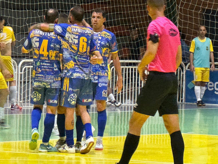 Jogadores do Imbituba Futsal comemorando o gol do Lukinha, o sexto da equipe Com um início de partida dominante, o Imbituba Futsal abriu três gols de vantagem sobre a CME de São Ludgero e mesmo a equipe da casa esboçando a reação, no final da partida a diferença foi mantida. O jogo foi válido pelo Regional de Futsal 40Tão promovido pela Liga Urussanguense de Deporto – LUD e agora, para ser campeã, a equipe do técnico Thiago “Delega” vai ter que vencer o jogo da volta na casa do adversário.