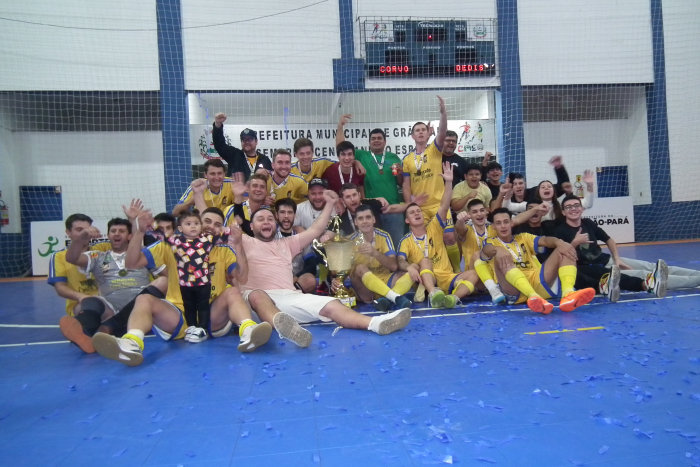 jogadores, dirigentes, comissão técnica, familiares e torcedores com a Taça Demay Uma bonita festa marcou a decisão do Campeonato Interempresas de Futsal de Grão-Pará edição 2023 na noite desta sexta-feira, 26 de maio. Ginásio Pedro Ivo tomado pelo público e no jogo seis gols e festa da torcida do Mercado Corvo Branco/Granjas DG, que bateu o Dedis/Di João por 5 a 1 e ficou com a Taça Demay Materiais de Construção.