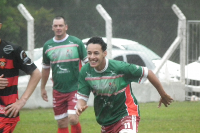 Rian comemora o seu segundo gol e o quarto do Aiurê Dois jogos deram sequência ao Municipal de Futebol de Grão-Pará neste domingo, 11. O palco foi o Estádio Perinzão, na comunidade do Rio do Meio e no primeiro jogo o Aiurê FC venceu o Atlético São João por 4 a 1 e no jogo seguinte o Stang FC venceu o Paula Ramos por 2 a 1.