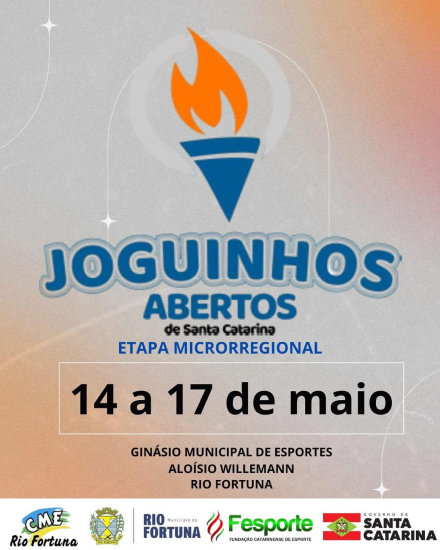Banner do Micro em Rio Fortuna A 11ª Etapa Microrregional dos Joguinhos Abertos começa nesta quarta, 14 e vai até sábado, 17, quando serão conhecidos os três municípios que irão representar a Região na Etapa Regional, que vai acontecer em São José entre os dias 11 e 14 de julho. Todos os jogos serão no Ginásio Aloísio Willemann.
