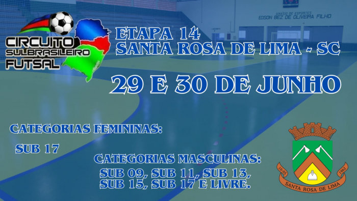 Muito futsal no Ginásio de Santa Rosa de Lima O município de Santa Rosa de Lima vai sediar uma das etapas mais aguardadas do Circuito Sul-Brasileiro de Futsal. Nos dias 29 e 30 de junho, o Ginásio Municipal Edson Bez de Oliveira Filho será o palco da Etapa 14 da competição, reunindo equipes de várias cidades do Sul Catarinense. A promoção e organização é da Semil Eventos, com apoio da CME local.