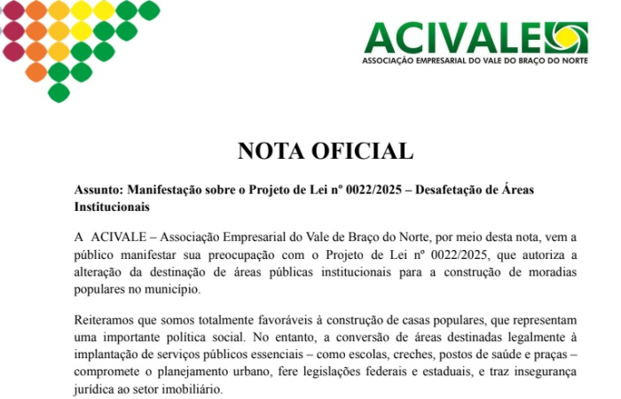 Nota oficial em que manifesta preocupação com o Projeto de Lei nº 0022/2025, de autoria do Poder Executivo Embora reafirme apoio à política habitacional, a Acivale — que representa mais de 500 empresas de Braço do Norte, São Ludgero e Grão-Pará — alerta que o uso de áreas públicas destinadas originalmente a serviços essenciais pode comprometer o planejamento urbano, gerar insegurança jurídica e impactar o setor imobiliário e a arrecadação municipal.