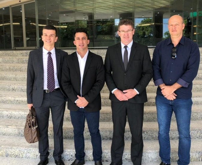 Na tarde desta quinta-feira, 05 de dezembro, uma comitiva catarinense esteve reunida na sede do Tribunal Regional Federal 4 (TRF-4), em Porto Alegre (RS), numa atitude pioneira no combate à instalação da fosfateira de Anitápolis (SC). O presidente da Associação de Municípios da Região de Laguna (Amurel), Roberto Kuerten Marcelino (PSD), o diretor Executivo da entidade, Celso Heidemann, além do advogado da associação, Peterson Medeiros de Oliveira e, também, Elton Heidemann, convidado para participar pelo envolvimento na causa. Eles visitaram o Gabinete da Vice-Presidência do Tribunal.