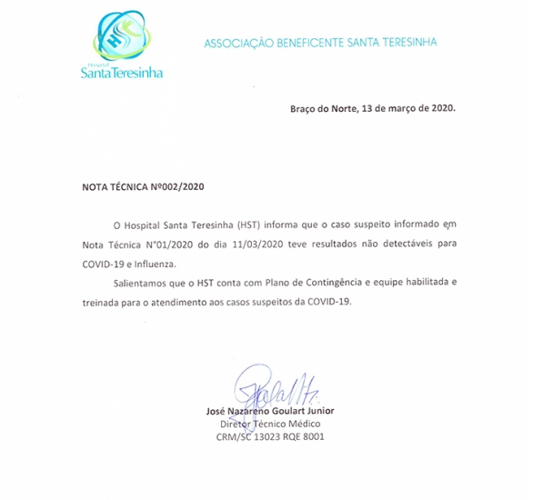 O Santa Teresinha fez o comunicado para a imprensa às 16 horas desta sexta-feira, após receber os resultados dos exames do Lacen (Laboratório Central do Estado de Santa Catarina), dizendo que o caso suspeito teve resultados não detectáveis para o Covid-19 e Influenza.