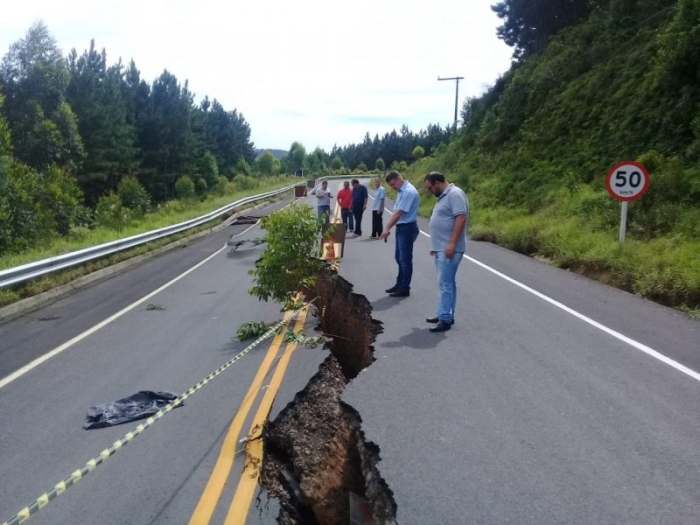 Secretário de Estado visitou a cidade na manhã de segunda-feira para ver os danos de perto. SC-370, recém-pavimentada, foi cortada por cratera