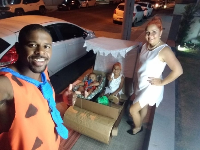 Entre os foliões que se divertiram na última sexta-feira em Braço do Norte, uma família chamou a atenção pela criatividade das fantasias e adereços. Os “Souzas” viraram os Flintstones. André, 35 anos, e a esposa Raquel, 32 anos, em 2018 foram fantasiados de Mickey e Minnie. Em 2019, como a esposa estava grávida, decidiram ficar em casa. Este ano, toda a família teria que participar do Carnaval. Começaram a pensar em várias alternativas de fantasias e foi justamente o Freddy e a Vilma, que veio a calhar, pois levariam juntos a Valentina, de 4 anos, e o Kaio, de apenas 9 meses, que passaram a ser a Pedrita e o Bam Bam. A próxima aparição da Família Flintstones será no Carnaval da Pracinha em Laguna, no domingo, e depois, na terça-feira, à tarde, no Carnaval Infantil do Clube Cruzeiro.
