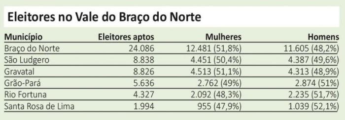 Ao todo, 53.707 eleitores estão aptos de irem às urnas em Braço do Norte, Grão-Pará, Rio Fortuna, São Ludgero, Santa Rosa de Lima e Gravatal no dia 15 de novembro. No Vale, em todas as cidades dois grupos políticos polarizam a disputa nas eleições majoritárias.