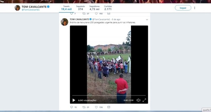 “Árbitro de tela plana 150 polegadas urgente para punir os infratores”. A frase escrita pelo humorista reconhecido nacionalmente, Tom Cavalcanti, em sua conta no Twitter, satiriza o vídeo de uma briga entre torcidas de times de Braço do Norte.