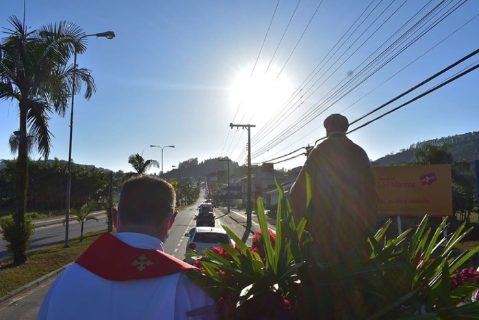 A imagem de São Marcos percorreu as principais ruas do Centro de Rio Fortuna neste sábado, 25 de abril, dia do padroeiro da Paroquia. Impedidos de participar das celebrações religiosas por conta do alto risco de contágio da Covid-19, devotos do santo foram convidados a comemorar a data enfeitando suas casas com laços e panos vermelhos, cor que recorda o martírio do Evangelista. Foi também de casa que eles receberam a benção do santo intercessor.
