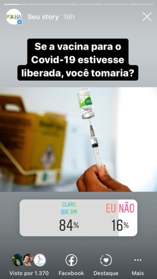 No Instagram da Folha do Vale esta mesma pergunta foi feita na quarta-feira. Durante as primeiras 18 horas de enquete, 84% (298 internautas) disseram que sim, tomariam a vacina e entre os 16% que disseram que não (57), a maioria justificou que só tomaria a vacina depois de ter a comprovação que realmente funciona.
