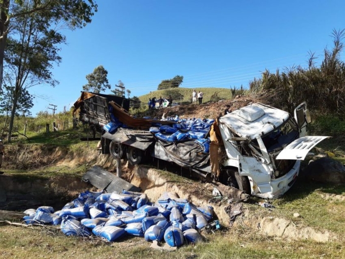 Com o capotamento, a carga de ração para peixes ficou espalhada no local. O condutor sofreu apenas escoriações nos membros superiores e recusou encaminhamento ao hospital.