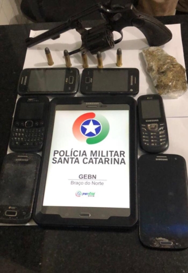 A guarnição da Polícia Militar, em rondas no bairro Rio Bonito, em Braço do Norte, abordou um homem em atitude suspeita, V.R.S., 25 anos. Após revista pessoal, foram encontrados 52,4 gramas de substância semelhante a maconha. Em conversa com o homem, o mesmo autorizou a entrada na residência, onde foi encontrado um revolver calibre 38 com cinco munições intactas.
