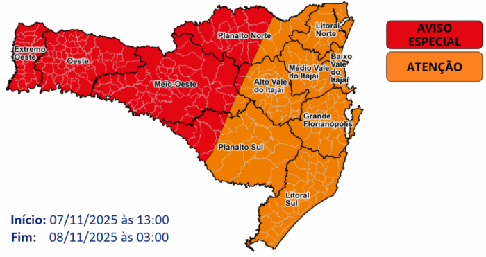 As instabilidades se formam ainda pela manhã nas áreas de divisa com o Rio Grande do Sul. No entanto, é durante a tarde que as tempestades ganham força, sobretudo no Grande Oeste e nos Planaltos, onde o risco para tempestades severas é maior. Entre o fim da tarde e a noite, os temporais avançam em direção à Grande Florianópolis, Vale do Itajaí e Litoral Norte.
